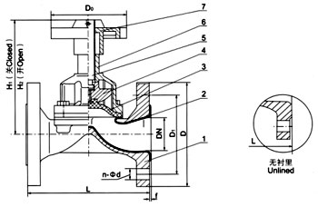 部件列表:1.閥體 2.閥體襯里 3.隔膜 4.閥瓣 5.閥桿 6.閥蓋 7.手輪