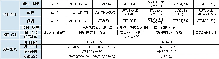(一)、耐腐蝕性 1、使用介質(zhì)如水、丙酮、酒精、氨、碳酸鋇、苯(WCB材質(zhì)的最低用溫度為-290C,最高溫度為4250C。) 2、使用介質(zhì)如顆粒、油品、紙漿、二氧化碳 氣(不銹鋼材質(zhì)的最低使用溫度為-1000C,最高使用溫度為2320C。) 3、嚴(yán)禁使用含氟離子液體(如HF等)也不能用強(qiáng)堿及磷酸(溫度>1500C 濃度>30%)。 (二)、不銹鋼的一般工作溫度:≤1500C (三)、壓力范圍:0.6~2.5MPa (四)、通徑范圍:25~250mm | | |
