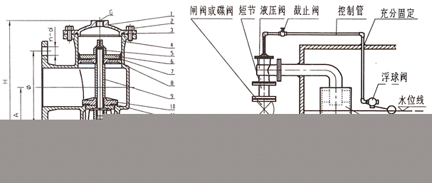 H142X液壓水位控制閥是一種自動(dòng)控制水箱、水塔液面高度的水力控制閥。當(dāng)水面下降超過(guò)預(yù)設(shè)值時(shí),浮球閥打開,活塞上腔室壓力降低,活塞上下形成壓差,在此壓差作用下閥瓣打開進(jìn)行供水作業(yè);當(dāng)水位上升到預(yù)設(shè)高度時(shí),浮球閥關(guān)閉,活塞上腔室壓力不斷增大致使閥瓣關(guān)閉停止供水。如此往復(fù)自動(dòng)控制液面在設(shè)定高度,實(shí)現(xiàn)自動(dòng)供水功能。