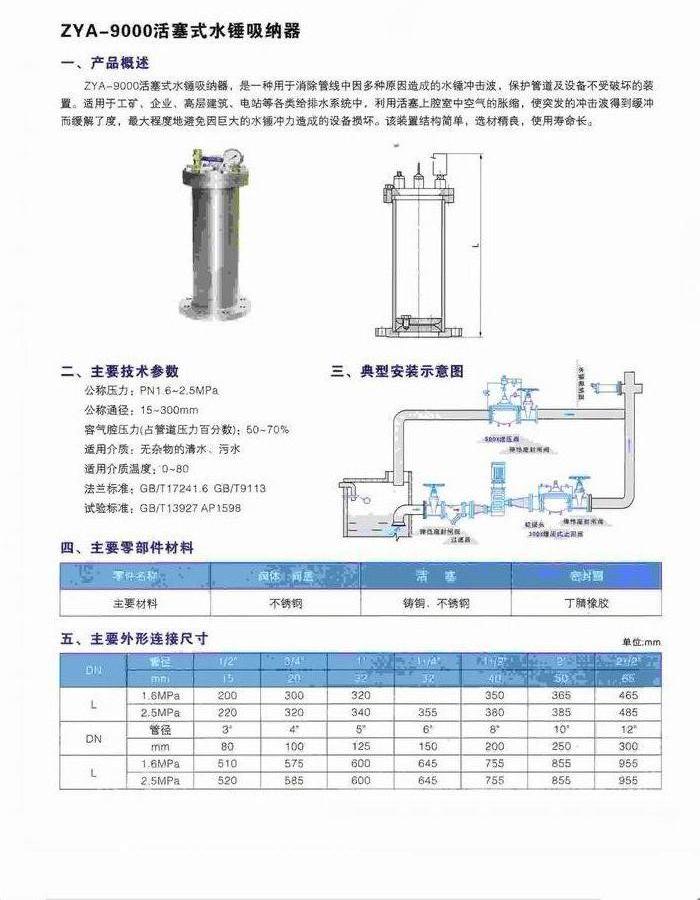 ZYA-9000活塞式水錘吸納器(水錘消除器)是一種用于消除管線中因多種原因造成的水錘沖擊波,保護(hù)管道及設(shè)備不受破壞的裝置。水錘消除器適用于工礦、企業(yè)、高層建筑、電站等各類給排水系統(tǒng)中,利用活塞上腔室中空氣的脹縮,使突發(fā)的沖擊波得到緩沖而緩解了度,最大程度地避免因巨大的水錘沖力造成的設(shè)備損壞。該裝置結(jié)構(gòu)簡單、選材精良、使用壽命長。