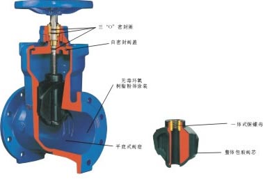 結(jié)構(gòu)特點(diǎn) 1.整體閥蓋暗桿設(shè)計(jì),結(jié)構(gòu)緊湊;閥桿螺母與閘板兩體結(jié)構(gòu),無(wú)卡阻現(xiàn)象發(fā)生;直通道,無(wú)泄留凹腔;閥桿密封采用“O”形密封圈。 2.有優(yōu)秀的防腐性能,殼體內(nèi),外表面噴涂環(huán)氧樹脂,需要時(shí)內(nèi)表面襯搪瓷;連接螺栓采用內(nèi)六角螺栓,頂部膠封。 3.可靠的衛(wèi)生性環(huán)氧樹脂符合衛(wèi)生標(biāo)準(zhǔn)GB/T17219-1998,閘板整體包覆符合衛(wèi)生檢驗(yàn)的橡膠;閥桿、閥桿螺母等零件采用不受水腐蝕的不銹鋼或青銅等到材料。 適用飲用水、給排水、污水處理、天然氣與煤氣、工業(yè)以及食品等行業(yè)。