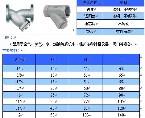 用途及特點(diǎn) Y型過濾器是輸送介質(zhì)的管道系統(tǒng)不可缺少的一種裝置,通常安裝在水力控制閥或其它設(shè)備的進(jìn)口端,用來清除介質(zhì)中顆粒性雜質(zhì),以保護(hù)閥門設(shè)備的正常使用。Y型過濾器的過濾網(wǎng)采用不銹鋼雙層網(wǎng)結(jié)構(gòu),堅(jiān)固耐用,具有結(jié)構(gòu)先進(jìn)、流阻小、排污方便等特點(diǎn),可用于水、蒸氣、油品、硝酸、尿素、氧化性介質(zhì)等多種介質(zhì)?筛鶕(jù)用戶需要設(shè)置過濾網(wǎng)的目數(shù),一般通水網(wǎng)為18-30目,通氣網(wǎng)為40-100目,通油網(wǎng)為100-480目。連接形式法蘭式